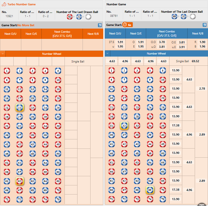 A number game is played by betting on the numbers of the balls drawn from a bingo machine. There are 75 different numbers to choose from and 3 of those numbers are drawn in each game. Players may place bets during each ball interval to guess the outcome of the next ball, and different odds will be given for every single ball drawn. All game results shall be settled after each ball is drawn.